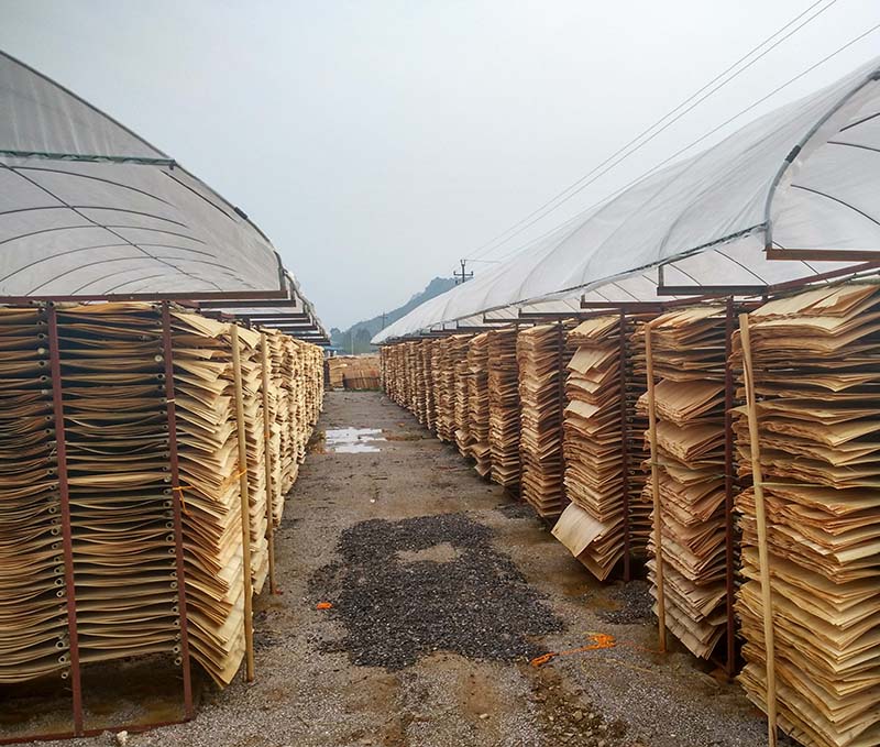 与单板旋切相配套的是,单板大晒场。200亩的晒板场满满的都是芯板,晒板场主要晒旋切刨出来的板材每天的板材晒干收,收完再晒,重复使用无间断。工人们巡场检查板是否晒干,更重要的是在巡查中一遍遍地挑出那些不合格的二级和三级板,保证林世界木业模板原材料的好品质。